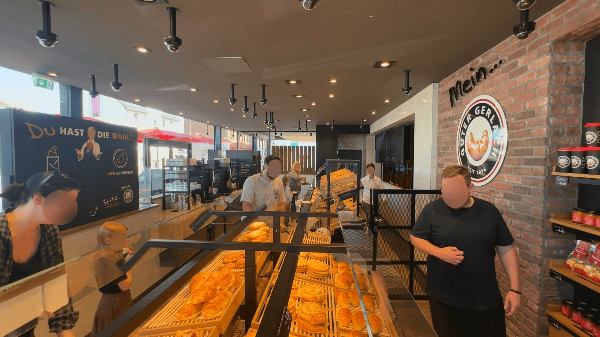 Ceiling cameras track and charge automatically. GDPR compliant.